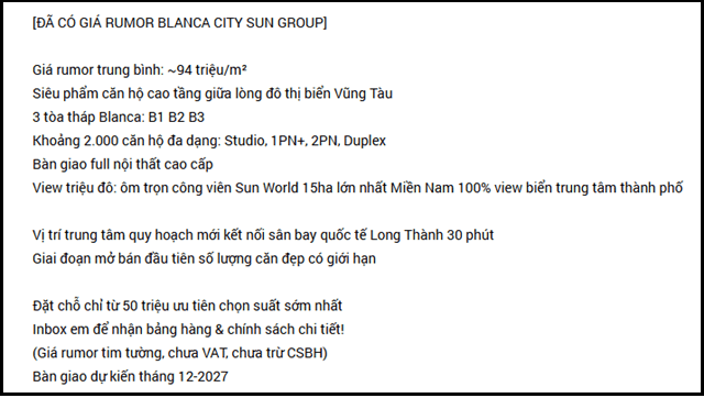 “Giá rumor trung bình khoảng 94 triệu/m². Mức giá tim tường, chưa bao gồm VAT và chưa áp dụng chính sách bán hàng. Dự kiến bàn giao vào tháng 12/2027”, một tin rao trên batdongsan.com.vn cho biết.